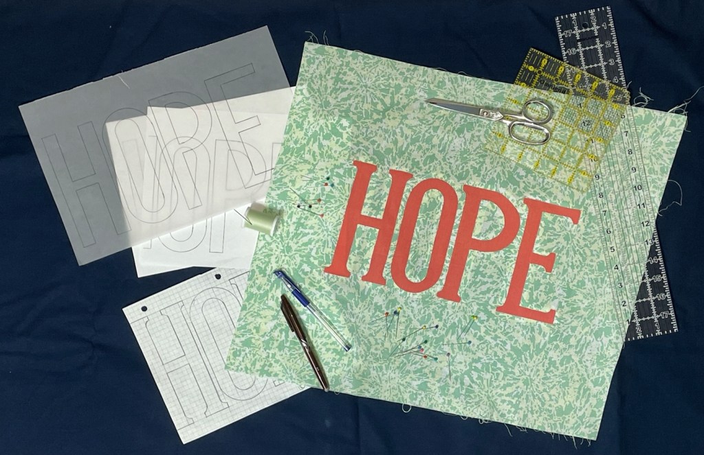 Using the “HOPE” template as a starting point, students are introduced to designing with type and brainstorm ways to alter the template for their own interpretation of the word “HOPE” which is then executed in the reverse appliqué technique. The “spotlight word” for this workshop can be substituted upon request.